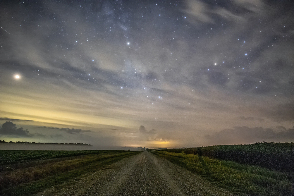 The Milky Way peaking through the clouds and fog as a bit of lightning strikes off in the distance, the dirt roads of Southern Illinois and dark skies make for some great images.